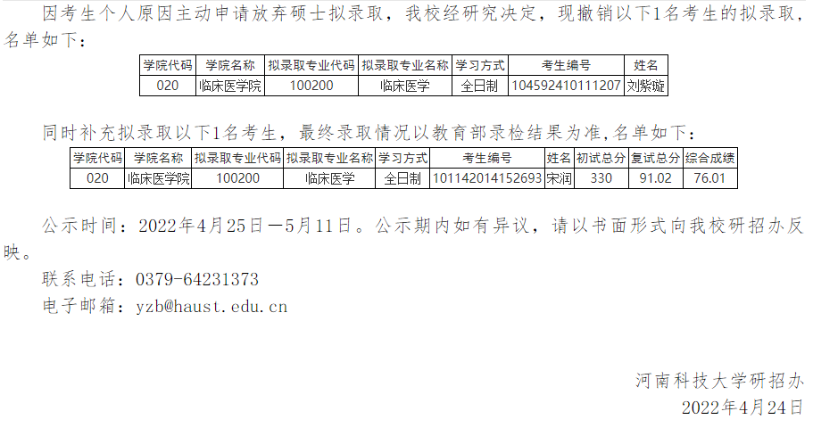 以上就是“2022考研擬錄取名單:河南科技大學關于撤銷及補錄2022年碩士統考生的公示”的全部內容,更多錄取名單相關內容請持續關注本網站。