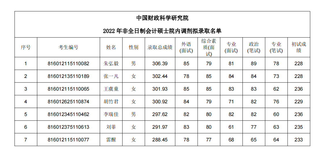 原文標題:中國財政科學研究院2022年非全日制會計碩士院內調劑擬錄取名單