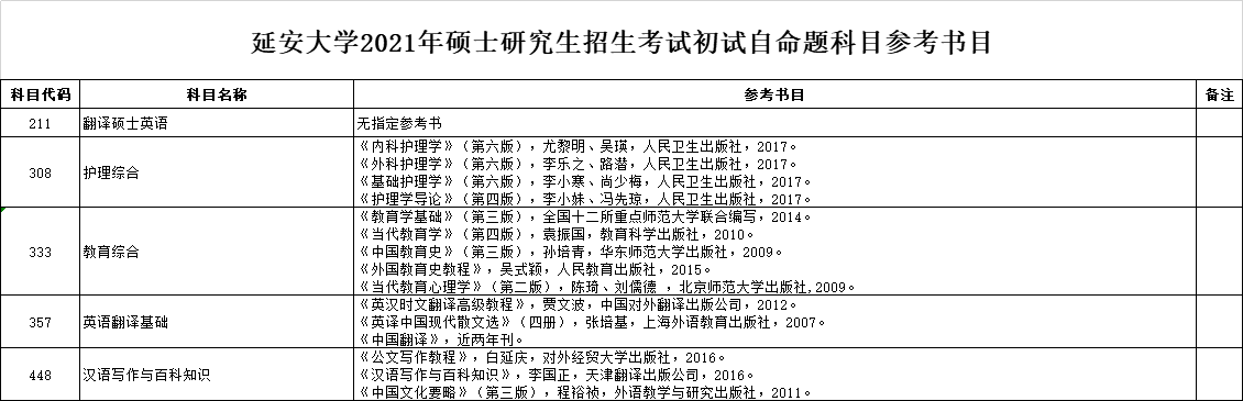 點(diǎn)擊查看:延安大學(xué)2021年碩士研究生招生考試初試自命題科目參考書目.xlsx