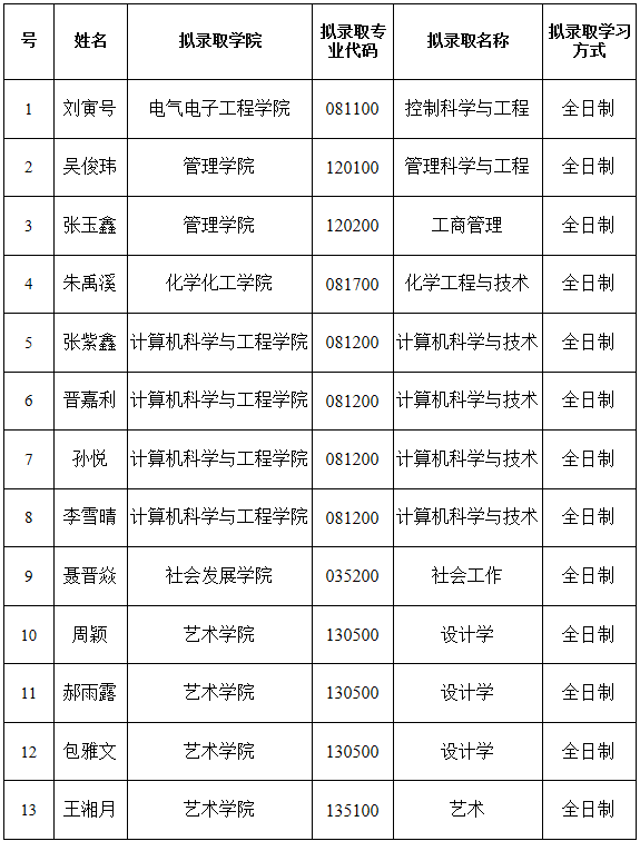 根據(jù)《全國普通高等學(xué)校推薦優(yōu)秀應(yīng)屆本科畢業(yè)生免試攻讀碩士學(xué)位研究生工作管理辦法(試行)》(教學(xué)〔2006〕14號)、《教育部辦公廳關(guān)于進(jìn)一步加強(qiáng)推薦優(yōu)秀應(yīng)屆生免試攻讀研究生工作的通知》(教學(xué)廳〔2013〕8號)、《教育部辦公廳關(guān)于進(jìn)一步完善推薦優(yōu)秀應(yīng)屆本科畢業(yè)生免試攻讀研究生招生工作辦法的通知》(教學(xué)廳〔2014〕5號)、《關(guān)于進(jìn)一步規(guī)范和加強(qiáng)推薦優(yōu)秀本科畢業(yè)生免試攻讀研究生工作的通知》(教學(xué)廳[2020]12號)、《2021年全國碩士研究生招生工作管理規(guī)定》(教學(xué)函[2020]8號)等文件規(guī)定,經(jīng)過學(xué)生報名,學(xué)校資格審查、復(fù)試、審核,擬錄取以下人員攻讀天津理工大學(xué)2021級碩士研究生,現(xiàn)將擬錄取名單公示如下。如有異議,請與天津理工大學(xué)研招辦(電話:022-60215566)聯(lián)系。