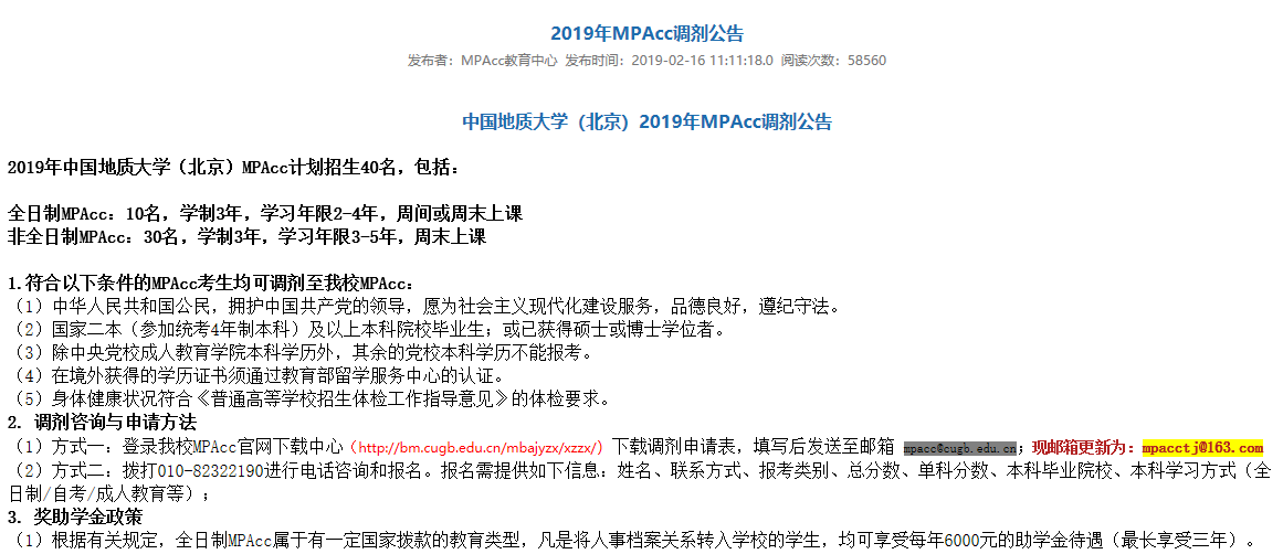 (2)我校MPAcc官網(wǎng)(http://bm.cugb.edu.cn/mbajyzx/)發(fā)布調(diào)劑復(fù)試通知。