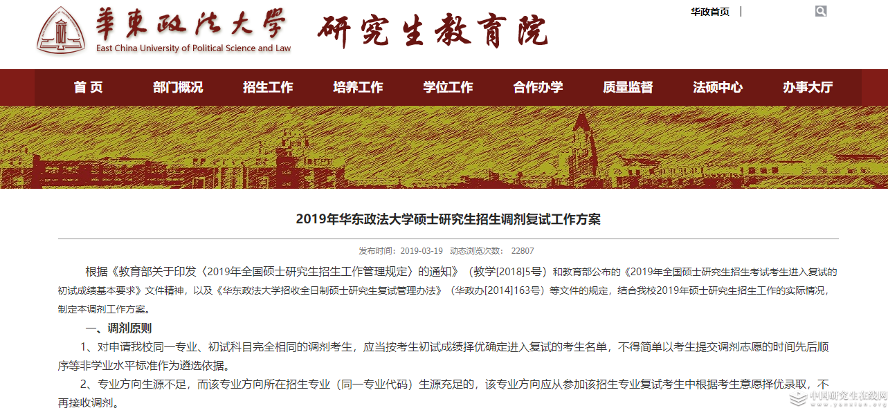 根據《教育部關于印發〈2019年全國碩士研究生招生工作管理規定〉的通知》(教學[2018]5號)和教育部公布的《2019年全國碩士研究生招生考試考生進入復試的初試成績基本要求》文件精神,以及《華東政法大學招收全日制碩士研究生復試管理辦法》(華政辦[2014]163號)等文件的規定,結合我校2019年碩士研究生招生工作的實際情況,制定本調劑工作方案。