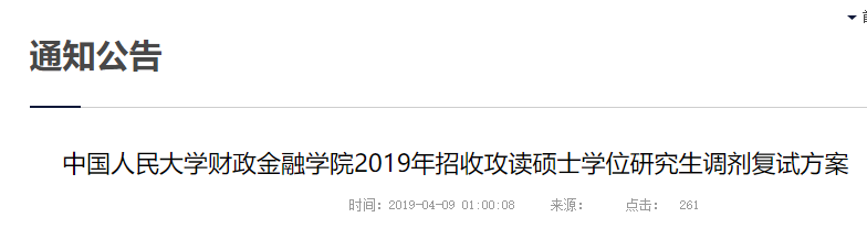 根據《中國人民大學碩士研究生復試工作管理辦法》中關于調劑復試的相關規定,我院對2019年攻讀碩士學位研究生調劑復試相關事宜做如下安排: