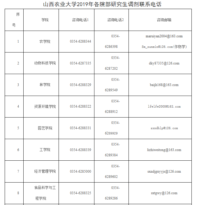 1、在教育部調(diào)劑系統(tǒng)開通前,考生可從研究生院網(wǎng)站下載中心下載《山西農(nóng)業(yè)大學(xué)2019年碩士研究生調(diào)劑申請(qǐng)表》,聯(lián)系下表中調(diào)劑專業(yè)所在院部留存調(diào)劑資料,正式調(diào)劑以調(diào)劑系統(tǒng)開通后為準(zhǔn)。
