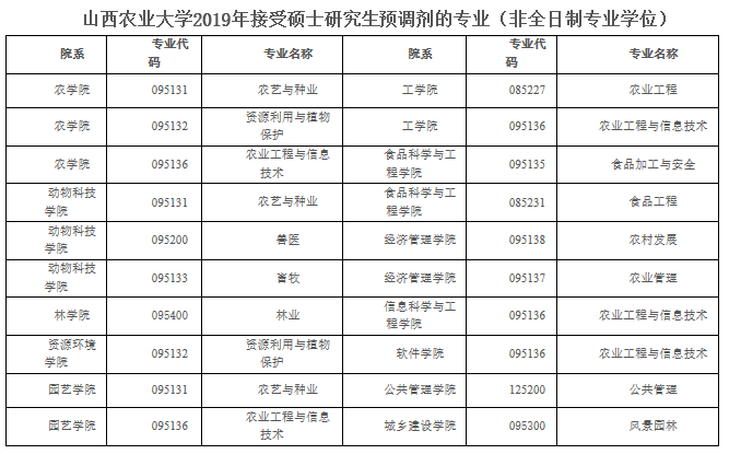 7、調(diào)劑考生的復(fù)試的具體安排及要求在“山西農(nóng)業(yè)大學(xué)研究生院網(wǎng)站”公布,我校將不再采用其它方式通知考生,考生隨時(shí)關(guān)注網(wǎng)上通知。復(fù)試科目查詢請(qǐng)登錄我校招生網(wǎng)頁(http://grs.sxau.edu.cn/index.htm)查詢。接受預(yù)調(diào)劑專業(yè)如下表所示: