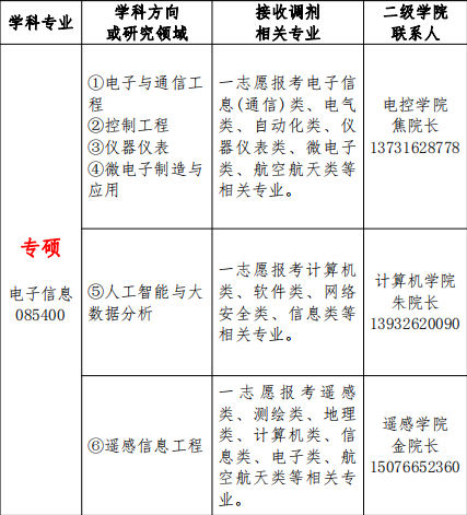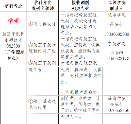 參考 2019 年國家復試分數線,2020 年報考專業與我校招生專業“航空宇航科學與技術”學碩(含飛行器設計、航空宇航推進理論與工程、航空宇航制造工程、航天遙感技術與應用等 4 個學科方向)和“電子信息”專碩 (含電子與通信工程、控制工程、儀器儀表、微電子制造與應用、人工智能與大數據分析、遙感信息工程等研究領域)相同或相近的考生也可準備調劑我校。