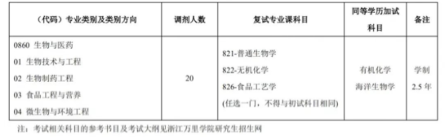 2.調劑專業:理學(生物學、海洋科學、化學、環境科學與工程、生物醫學工程、基礎醫學、藥學、中藥學)、工學(農業工程、林業工程、環境科學與工程、生物醫學工程、食品科學與工程、化學工程與技術、生物工程)、農學(水產、畜牧學、食品科學與工程、園藝學、作物學、農業資源與環境、植物保護、獸醫學、林學、草學、環境科學與工程、風景園林學)等。
