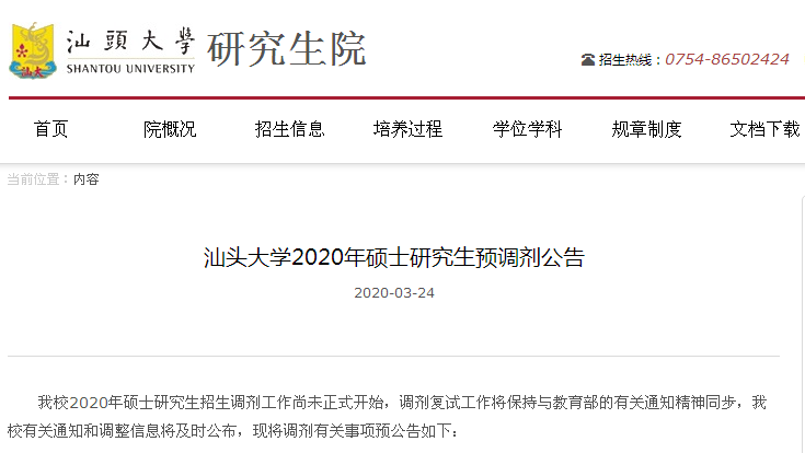 對于想調劑的同學來說,考研調劑信息很重要,但卻不知道哪里找?現多數院校已發布調劑公告。今天,小編給大家帶來的是“2020考研調劑信息:汕頭大學2020年碩士研究生預調劑公告”的相關內容,希望對大家有所幫助!