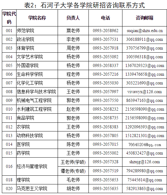根據(jù)教育部公布的《2020年全國(guó)碩士硏究生招生考試進(jìn)入復(fù)試的初試成績(jī)基本要求》B區(qū)線要求,我校部分專業(yè)一志愿上線情況良好,預(yù)計(jì)不接受調(diào)劑(表1),具體調(diào)劑信息以后期國(guó)家研招網(wǎng)調(diào)劑平臺(tái)發(fā)布的調(diào)劑信息為準(zhǔn)。目前《石河子大學(xué)2020年碩士研究生復(fù)試錄取工作方案》正在報(bào)上級(jí)部門審定中,屆時(shí)復(fù)試方式、復(fù)試時(shí)間、調(diào)劑公告等重要信息將會(huì)在“石河子大學(xué)研究生招生信息網(wǎng)”(http://yz.shzu.edu.cn/)主頁(yè)及相關(guān)學(xué)院網(wǎng)站及時(shí)公布,請(qǐng)考生關(guān)注查看。相關(guān)信息公布前,請(qǐng)考生耐心等待,確有特殊情況或需要進(jìn)一步了解相關(guān)內(nèi)容的,可向相關(guān)學(xué)院咨詢(表2)。