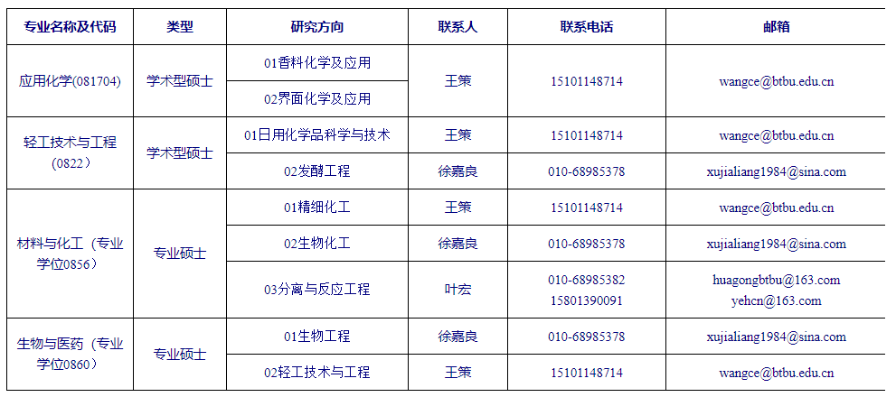 2021年北京工商大學輕工科學技術學院相關專業接收調劑考生預報名。接收預調劑的專業見下表。有意向調劑的考生根據自己實際情況,填寫《2021年輕工科學技術學院預調劑信息表》,發送至相關老師郵箱。