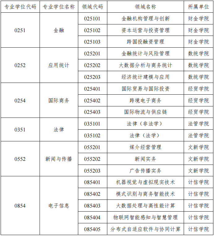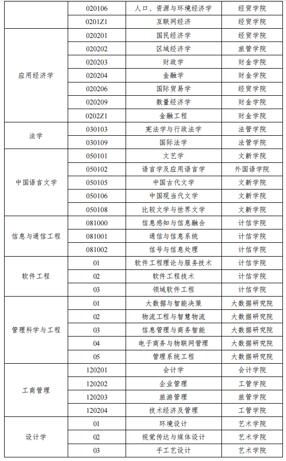 2、接受調劑的學科專業:理論經濟學、應用經濟學(除產業經濟學外)、法學(除民商法、刑法學外)、中國語言文學、信息與通信工程、軟件工程、管理科學與工程、工商管理、設計學學術碩士,金融、應用統計、國際商務、法律、新聞與傳播、電子信息專業碩士初試成績達到教育部公布的2021年研究生復試基本分數線(A類考生)要求。