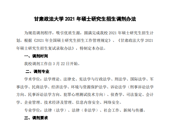 以上就是小編整理“2021考研調劑:甘肅政法大學2021年碩士研究生招生調劑辦法”的全部內容,想了解更多調劑信息,請持續關注本網站。