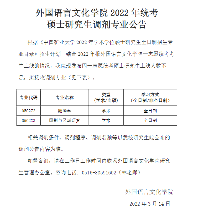 2022年中國礦業大學外國語言文化學院翻譯學、國別與區域研究調劑信息