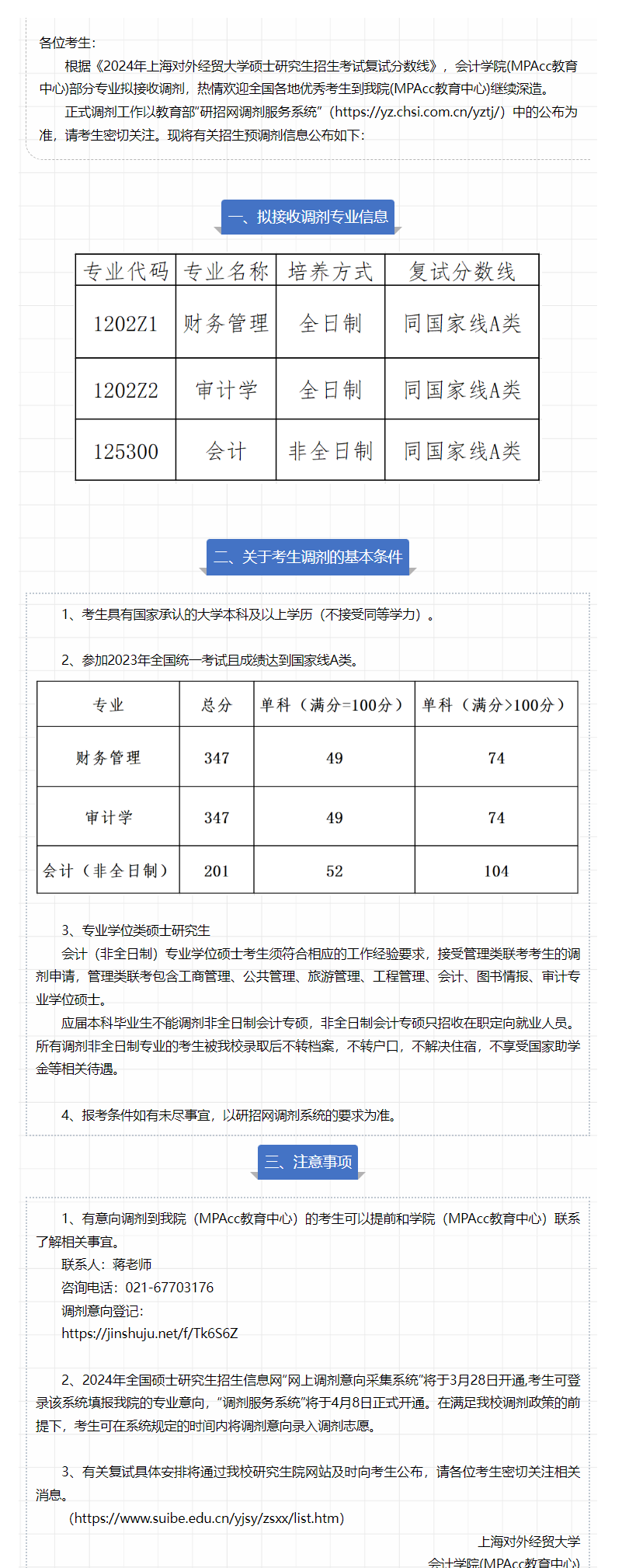 2024考研調劑:2024年上海對外經貿大學會計學院(MPAcc教育中心)碩士研究生預調劑公告