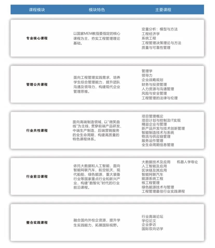 機動學院MEM項目以培養“基礎扎實、勇于創新、善于實踐”,具有家國情懷和國際視野的高層次工程管理人才為目標,持續更新教學理念,推進教學改革,提升課程質量。以經濟社會發展需求為牽引,設置專業核心課程、管理公共課程、行業共性課程、行業前沿課程、整合實踐課程等五大課程模塊,采用理論與實踐相結合的教學模式,綜合運用案例教學、學術研討、企業參訪、國際交流等手段,提升學生綜合管理能力。