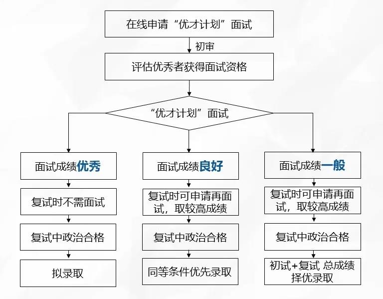 “優才計劃”提前面試等級為“優秀”,并且初試成績達到我校復試分數線考生,可以不參加復試的面試,在政治科目合格后直接擬錄取!