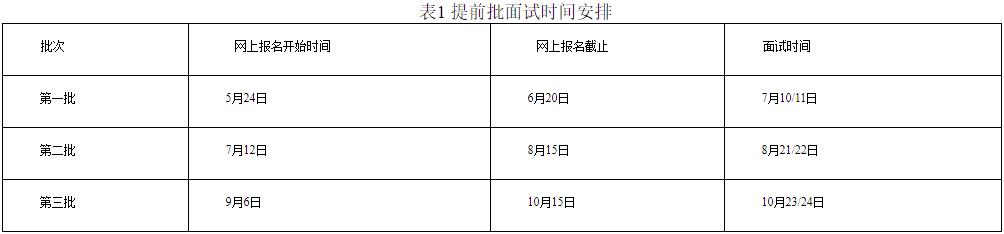 預計進行3次提前批面試,具體安排見表1(具體報名時間段,面試時間詳見每一批次面試前發布的具體通知)