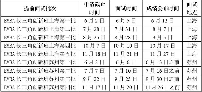 非全日制EMBA長三角創(chuàng)新班考生實(shí)行全面提前面試(提前面試項(xiàng)目須與報(bào)考項(xiàng)目及研究方向一致,不一致提前面試成績無效。同一報(bào)考項(xiàng)目及研究方向須且只能參加一次面試)。提前面試成績優(yōu)秀獲國家線條件錄取資格;提前面試成績合格以上且初試成績達(dá)EMBA項(xiàng)目復(fù)試分?jǐn)?shù)線其提前面試成績計(jì)入錄取成績進(jìn)行該項(xiàng)目排序錄取。