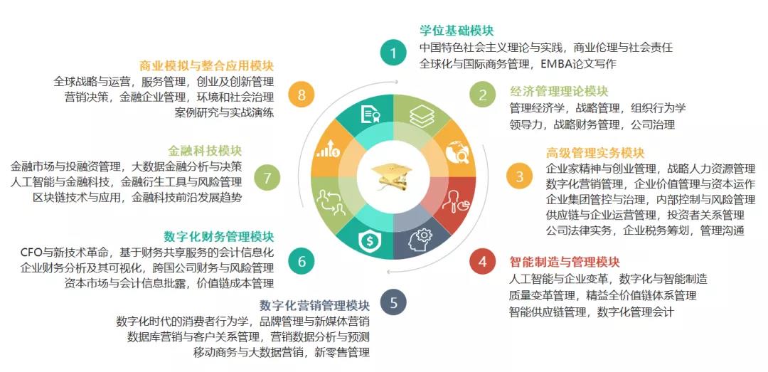 EMBA課程分為學(xué)位基礎(chǔ)模塊、經(jīng)濟(jì)管理理論模塊、高級(jí)管理實(shí)務(wù)模塊、專業(yè)方向選修模塊、商業(yè)模擬與整合應(yīng)用模塊。