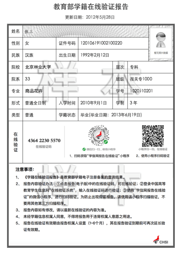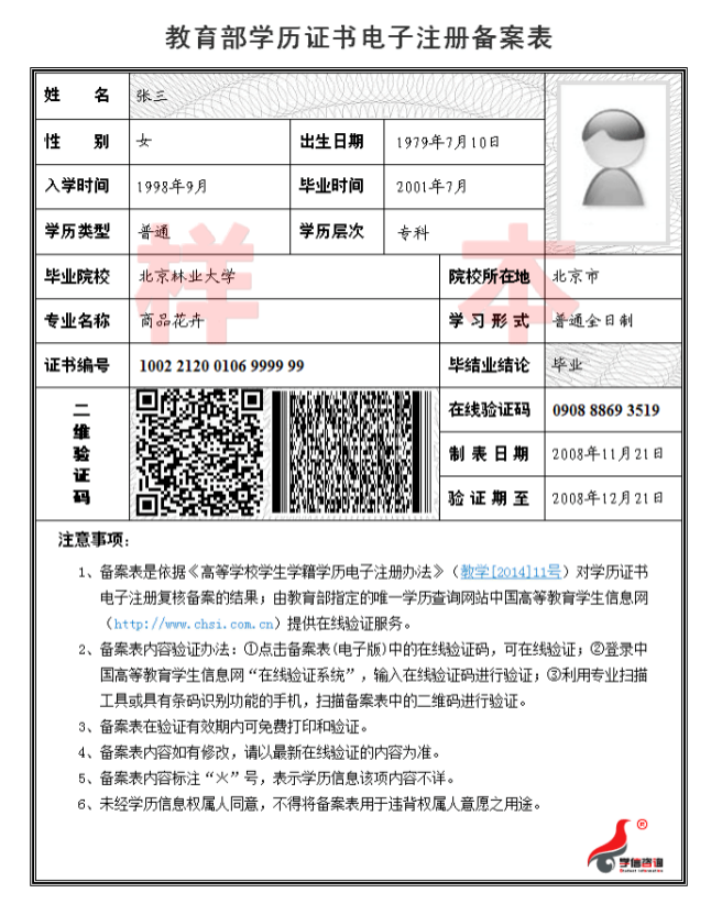 如報名系統提示未通過學歷校驗的考生還須上傳“中國高等教育學生信息網”的《教育部學歷證書電子注冊備案表》或《中國高等教育學歷認證報告》。樣稿如下: