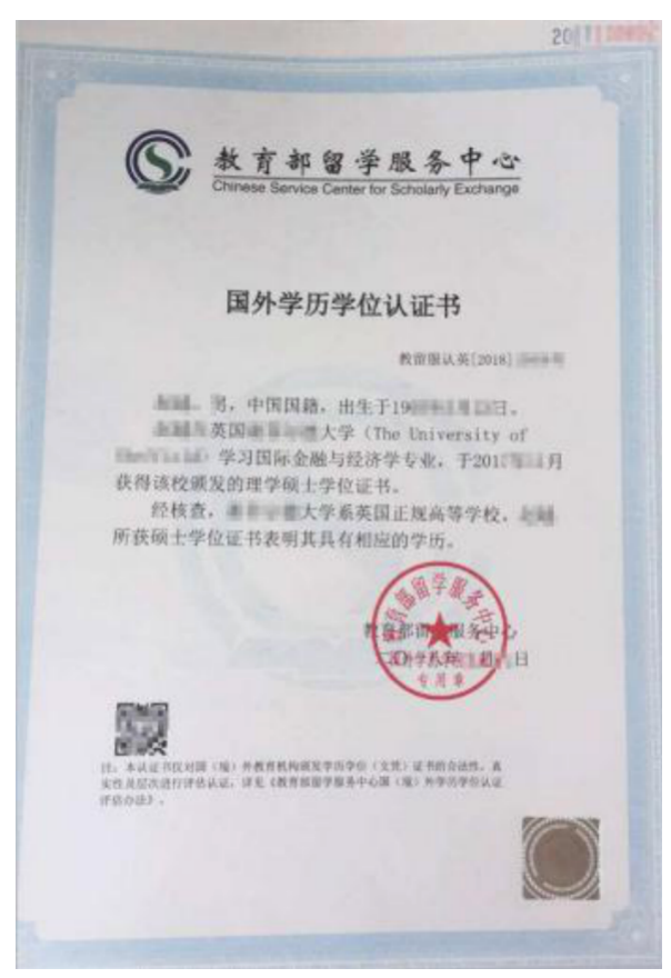2.在境外獲得學歷證書的考生,須上傳教育部留學服務中心出具的《國外學歷學位認證書》。樣稿如下: