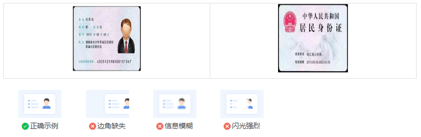 分正、反面兩張上傳。請確保身份證邊框完整,字跡清晰可見,亮度均勻,文字正向顯示。參考示例如下圖:
