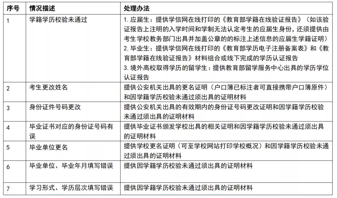 經(jīng)教育部對(duì)考生報(bào)名信息校驗(yàn),考生如出現(xiàn)以下情況,請(qǐng)按處理辦法準(zhǔn)備相關(guān)證明材料進(jìn)行網(wǎng)上確認(rèn)。