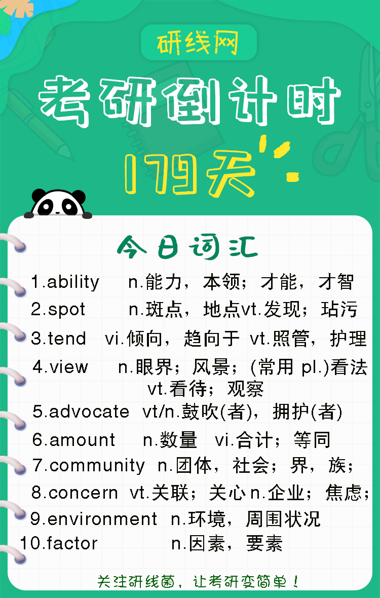 以上是研線網(wǎng)為考生整理的“2020考研英語(yǔ)詞匯高頻詞匯(6)”相關(guān)內(nèi)容,希望對(duì)大家有幫助,研線網(wǎng)小編預(yù)祝大家都能取得好成績(jī)!更多英語(yǔ)詞匯相關(guān)內(nèi)容盡在研線網(wǎng)!
