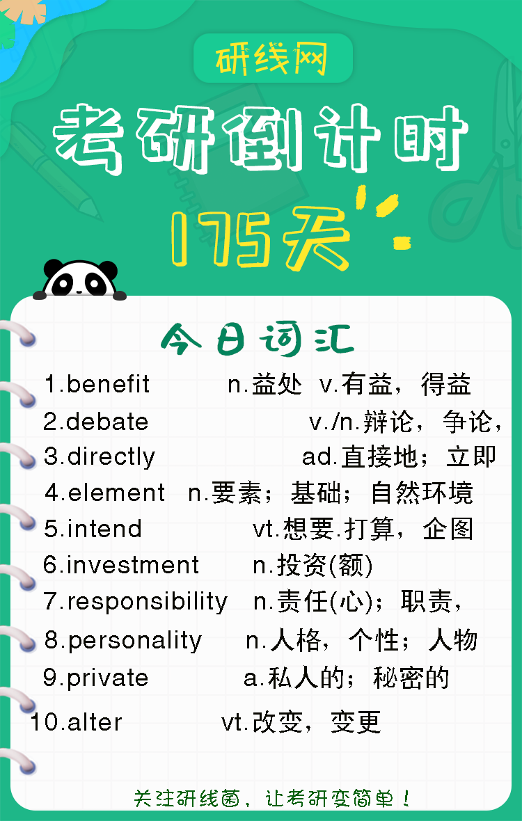 以上是研線網(wǎng)為考生整理的“2020考研英語詞匯高頻詞匯(10)”相關(guān)內(nèi)容,希望對(duì)大家有幫助,研線網(wǎng)小編預(yù)祝大家都能取得好成績(jī)!更多英語詞匯相關(guān)內(nèi)容盡在研線網(wǎng)!