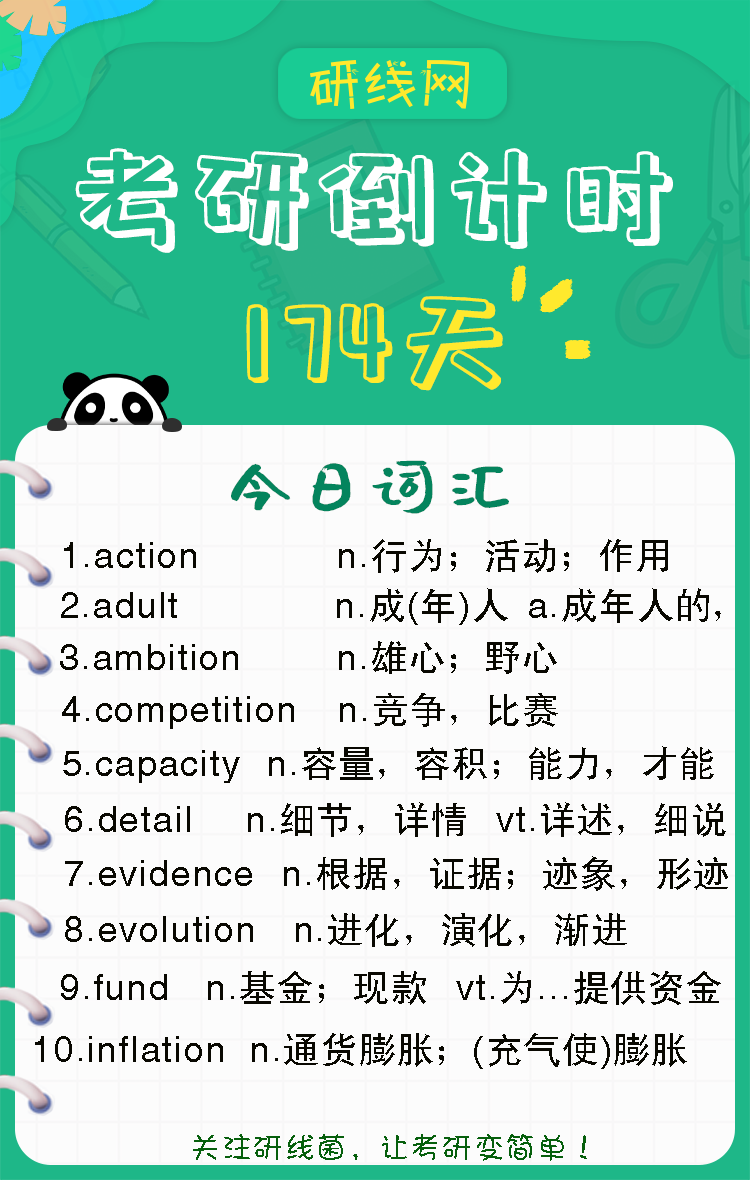 以上是研線網為考生整理的“2020考研英語詞匯高頻詞匯(11)”相關內容,希望對大家有幫助,研線網小編預祝大家都能取得好成績!更多英語詞匯相關內容盡在研線網!