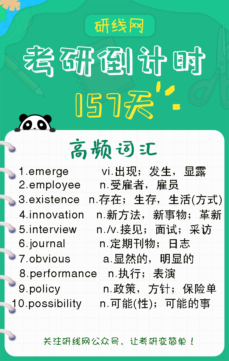 以上是研線網為考生整理的“2020考研英語詞匯高頻詞匯(29)”相關內容,希望對大家有幫助,研線網小編預祝大家都能取得好成績!更多英語詞匯相關內容盡在研線網!