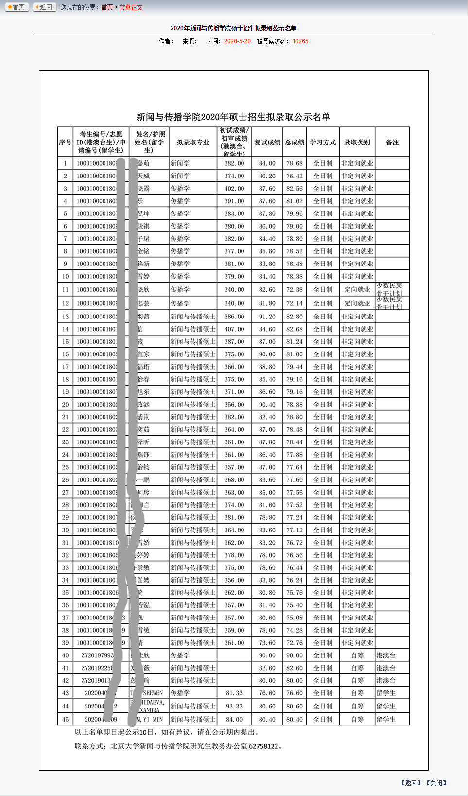 以上就是“2020考研擬錄取名單:北京大學(xué)新聞與傳播學(xué)院2020年新傳碩士擬錄取名單公示”的全部名單信息,同學(xué)們記得關(guān)注一下。考研加油!