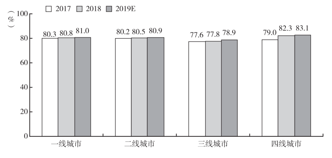 圖1:2017-2019年互聯網在不同級別城市居民中的日到達率