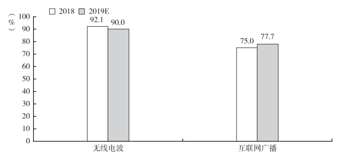 移動互聯網爆發后,網絡音頻市場快速發展,伴隨智能手機、智能音箱等音頻終端產品的普及,有聲讀物、在線音樂、移動廣播等音頻產品和服務廣受歡迎。在國內,喜馬拉雅、荔枝、蜻蜓FM等音頻應用發展迅猛,逐漸衍生出有聲讀物、財經、歷史等知識付費和脫口秀內容。由于音頻媒體具有場景和行為伴隨性,用戶可以在各種場景中充分利用碎片化時間,以聽的形式來實現信息的獲取,不需要訴諸視覺和觸覺等感官,“耳朵經濟”正悄然興起。CNRS-TGI數據顯示,廣播收聽渠道向互聯網廣播滲透(見圖2)。