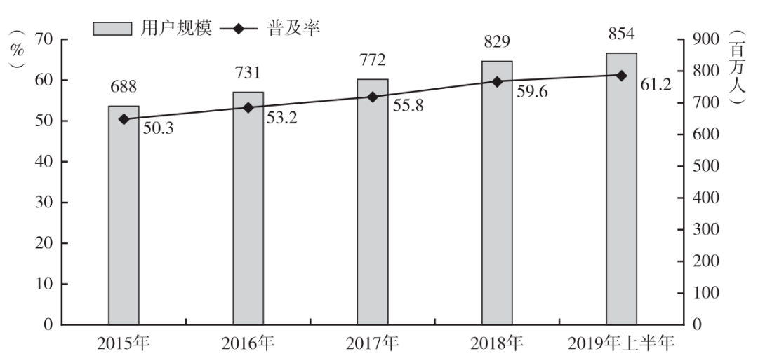 圖3:2015-2019年上半年中國互聯網用戶規模及普及率