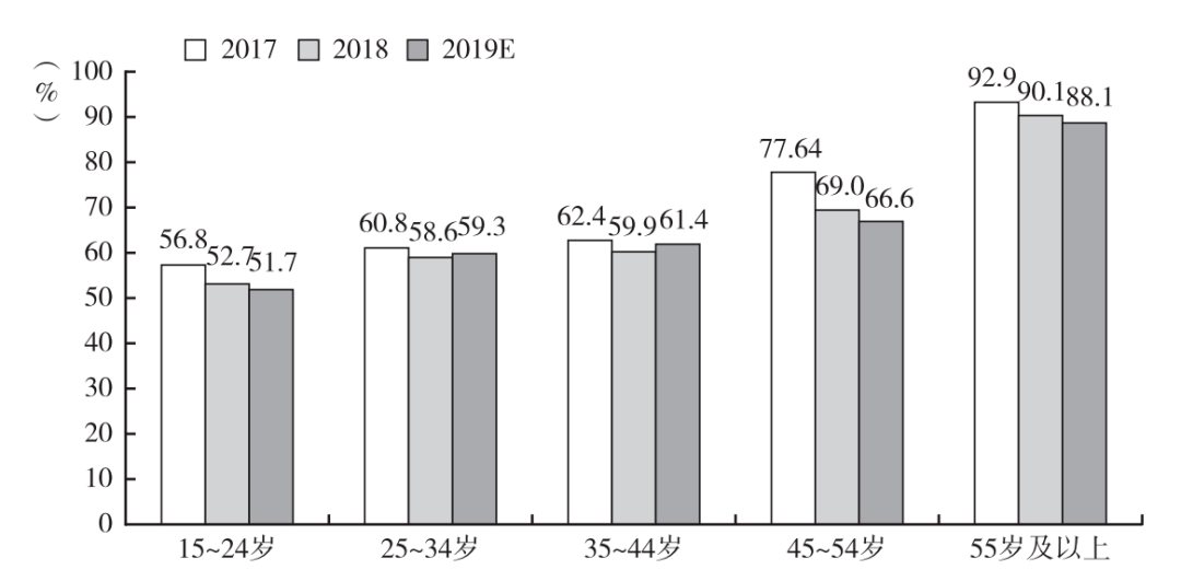 CNNIC數據顯示,2018年我國互聯網用戶同比增長7.4%,年度新增互聯網用戶約5700萬人。2019年上半年,我國互聯網用戶規模進一步增長至8.54億人,互聯網普及率提高至61.2%(見圖3),互聯網核心用戶(“00后”“90后”“80后”)占互聯網總用戶的65.1%。其中“00后”人群互聯網普及率近95%,“90后”人群互聯網普及率100%,“80后”人群互聯網普及率約94%。互聯網核心用戶層已充分滲透、面臨飽和壓力,而以“70后”為代表的中老年人群市場增長空間較大。