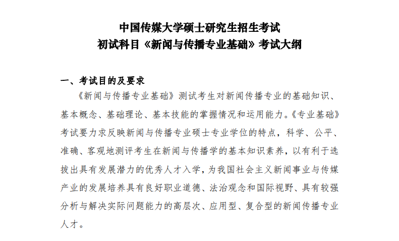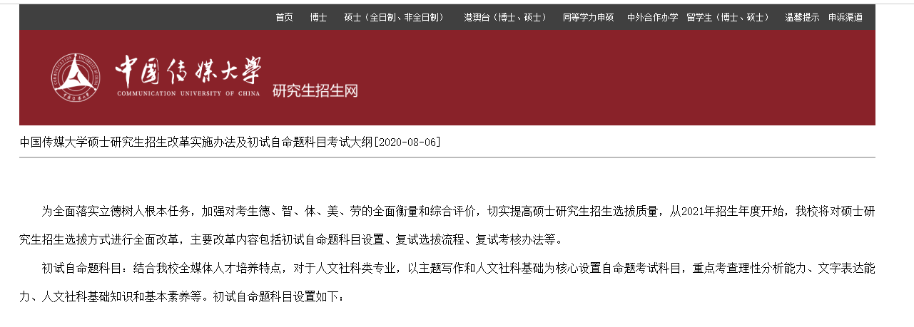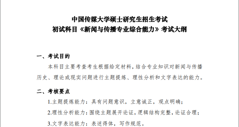 初試自命題科目:結合我校全媒體人才培養特點,對于人文社科類專業,以主題寫作和人文社科基礎為核心設置自命題考試科目,重點考查理性分析能力、文字表達能力、人文社科基礎知識和基本素養等。