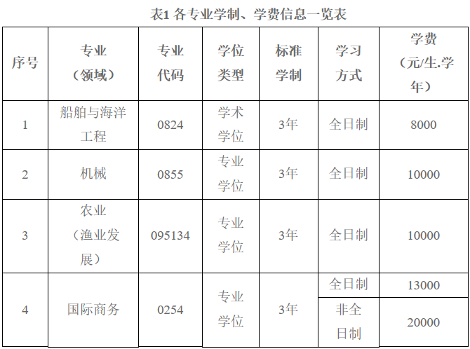 我校各碩士研究生專業學習年限均為3——5年,各專業學位的學制、學費等信息見表1。