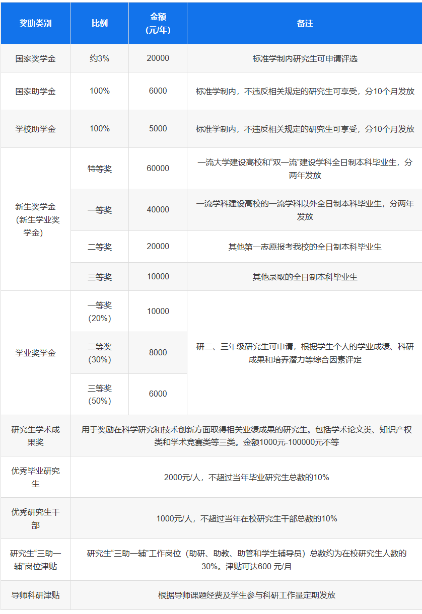 學(xué)校依托地區(qū)經(jīng)濟(jì)發(fā)展優(yōu)勢(shì),加大經(jīng)費(fèi)投入力度,努力為研究生創(chuàng)造較好的學(xué)習(xí)條件。主要獎(jiǎng)(助)學(xué)金如表所示。表中各類獎(jiǎng)助學(xué)金僅面向全日制非定向就業(yè)碩士研究生評(píng)選,評(píng)選細(xì)則以學(xué)校相關(guān)文件及通知為準(zhǔn)。表中具體內(nèi)容如有調(diào)整或其它未盡事宜以學(xué)校最新文件為準(zhǔn)。