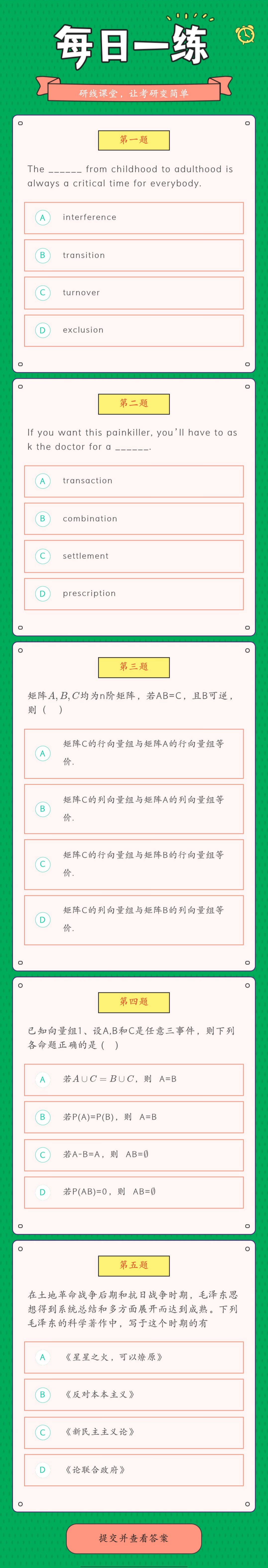 以上就是今日每日一練的全部內容,跟著每日一練,考研輕松復習!更多考試練習,點擊考研每日一練