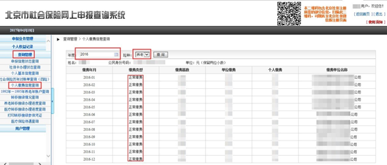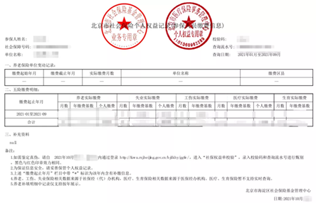 個人權益記錄需要提供北京市社會保險網上申報查詢系統 顯示“正常繳費”截圖,以及加蓋兩紅章的“北京市社會保險個人權益記錄”,如下圖所示。