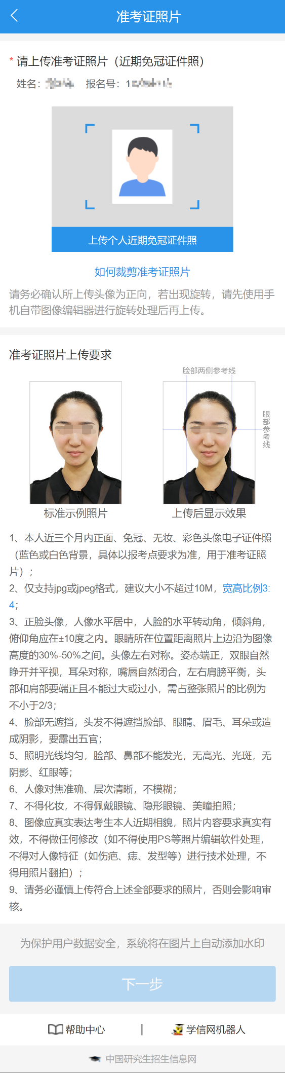 (1)考生本人準考證照片,最近三個月內正面、免冠、無妝、彩色一寸電子證件照(白色背景,用于準考證照片等),寬高比例3:4;坐姿端正,雙眼自然睜開并平視,雙耳對稱,左右肩膀平衡,頭部和肩部要端正且不能過大或過小,需占整個照片的比例為2/3。照片格式與文件大小詳見系統要求,對考生提供的無法清晰、準確辨識的照片,將置為“審核不通過”,考生須重新提交照片材料進行審核。