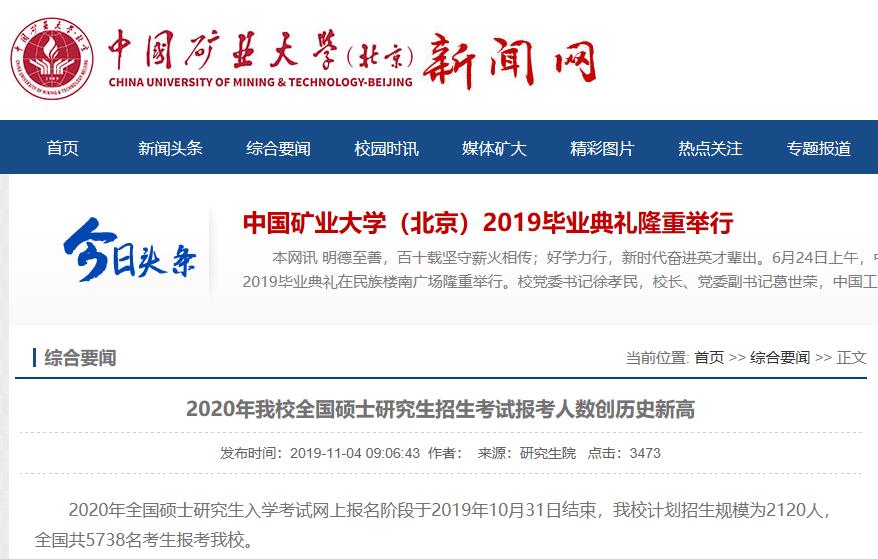 2020年全國(guó)碩士研究生入學(xué)考試網(wǎng)上報(bào)名階段于2019年10月31日結(jié)束,我校計(jì)劃招生規(guī)模為2120人,全國(guó)共5738名考生報(bào)考我校。