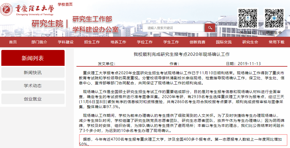 重慶理工大學報考點2020年全國研究生招生考試現場確認工作已于11月10日順利結束。現場確認工作得到了重慶市教育考試院和學校領導的高度重視。分管校領導廖林清副校長親臨現場,檢查指導現場確認工作,保衛處、學生處、信息中心、宣傳部等部門協同配合,共同保證了現場確認工作的順利完成。