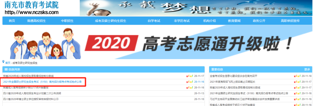 報考點為院校則可以搜索該院校的研究生院或研究生招生信息網,找到碩士招生欄目或通知公告欄目。