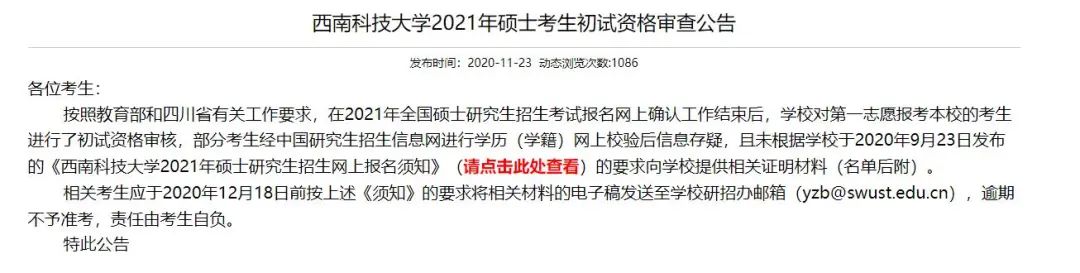 相關(guān)考生應(yīng)于2020年12月18日前按上述《須知》的要求將相關(guān)材料的電子稿發(fā)送至學(xué)校研招辦郵箱(yzb@swust.edu.cn),逾期不予準(zhǔn)考,責(zé)任由考生自負(fù)。