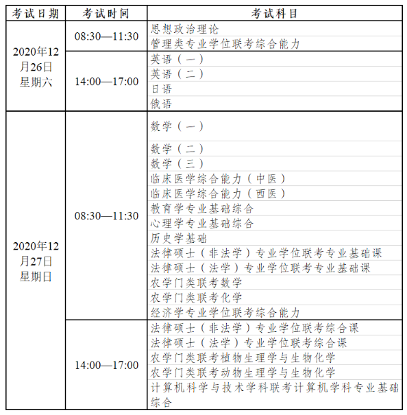 六、2021年全國碩士研究生招生考試初試全國統一命題科目考試時間:
