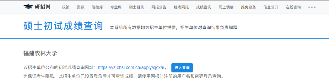 福建農林大學考研初試成績查詢入口:https://yz.chsi.com.cn/apply/cjcx/sch/10389.dhtml