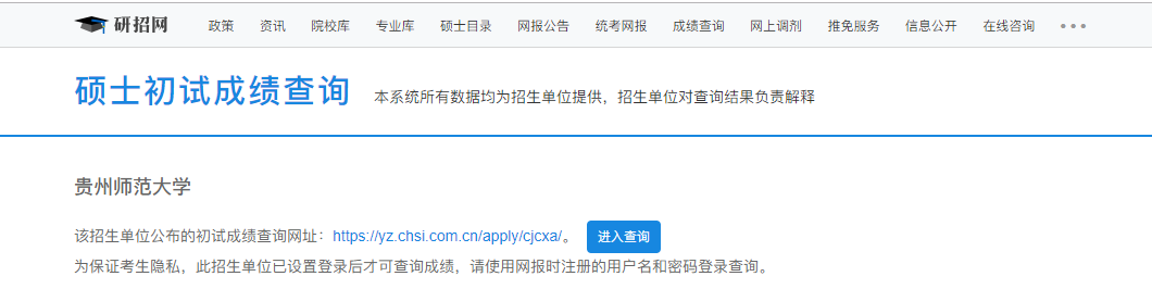 以上就是小編整理“2021考研初試成績:貴州師范大學考研初試成績查詢入口開啟!初試成績已公布!”的全部內容,想了解更多相關信息請持續關注本網站。