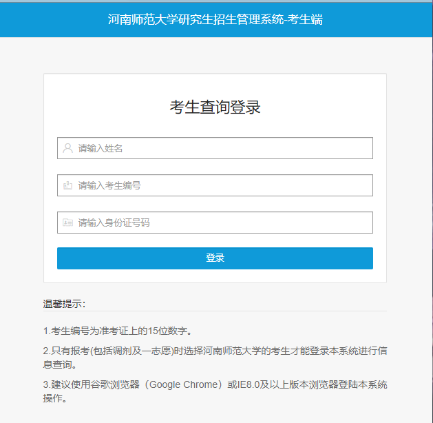 (網(wǎng)址:https://zhaosheng.eol.cn/10476/main/user/index)進(jìn)入系統(tǒng)登錄頁面后,通過輸入姓名、考生編號(準(zhǔn)考證號)和身份證號碼登錄進(jìn)入系統(tǒng)。